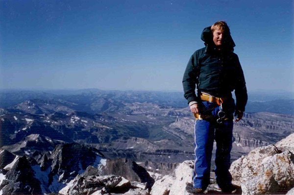 Kelley has climbed the five tallest peaks in the lower 48 states including the Grand Tetons (see photos of the range in the above banner and the author on the summit to the left).